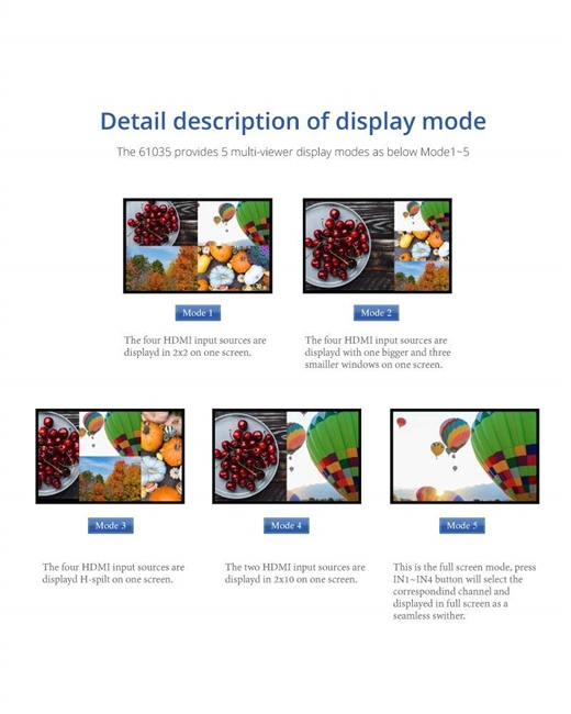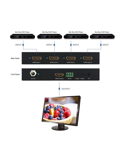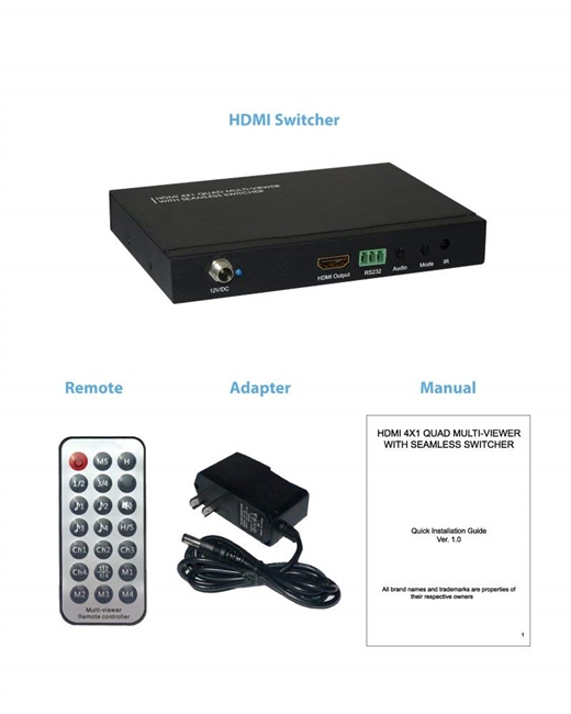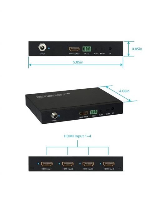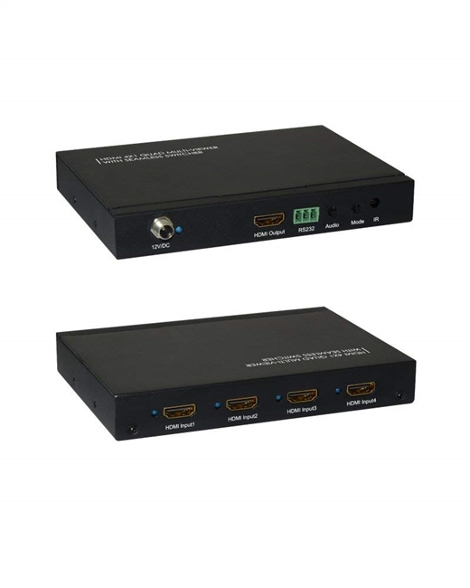 This HDMI 4X1 Switch is a high performance 4 by 1 Quad Multi-Viewer with the seamless switcher. It supports four HDMI input sources to be displayed on one screen with five multiview modes. As a switcher, it can also seamlessly switch the four HDMI input freely.The product can be controlled in various ways, through the front panel buttons, IR,RS232 control etc.